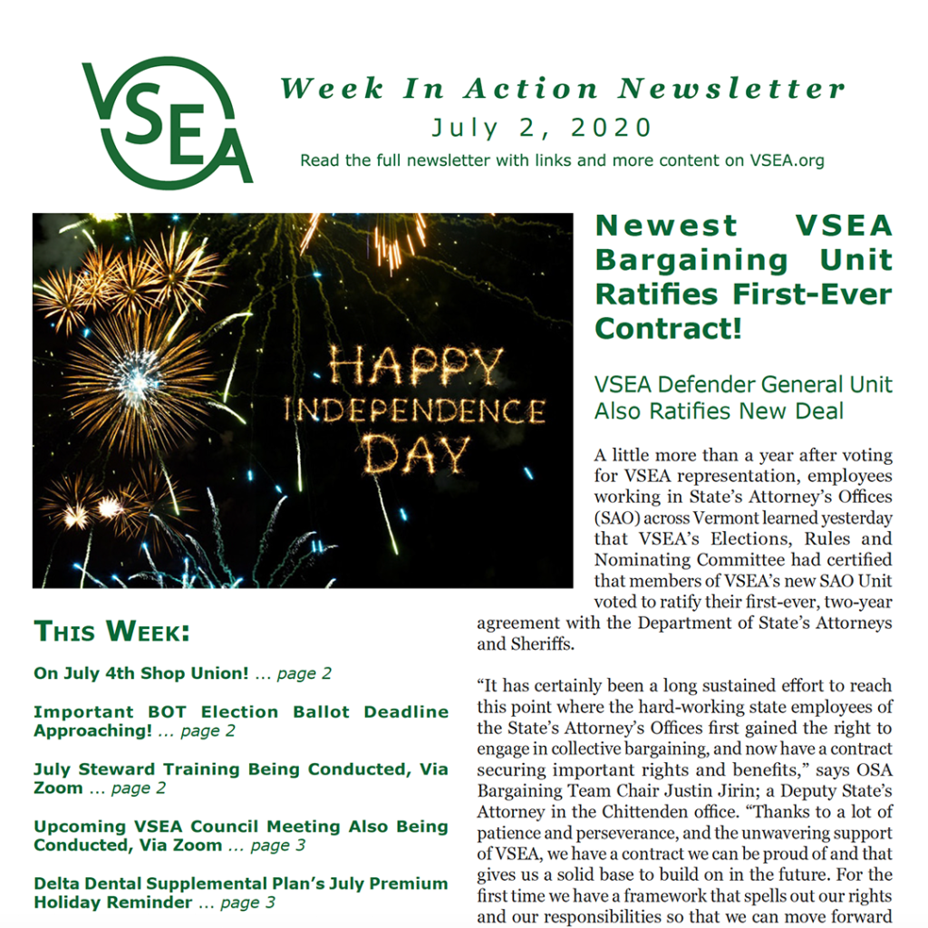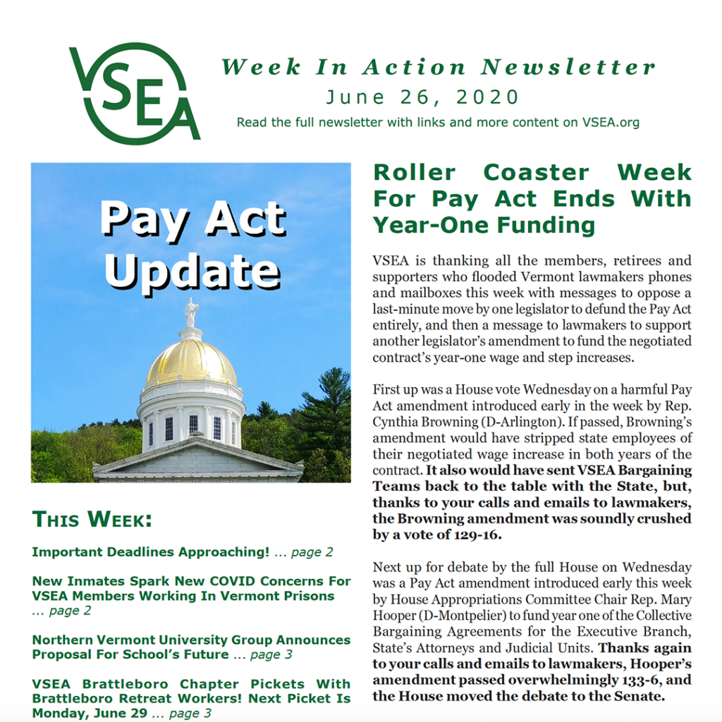 The Legislature’s plan reads that it will take up the issue of funding year two of the Non-Management, Corrections, Supervisory, State’s Attorneys, and Judicial Unit contracts at a later date. This could be in the fall, or it could be this coming winter when the new Legislature convenes in January 2021. Either way, VSEA is counting on your continued support in the continued fight for full funding of the negotiated contract.