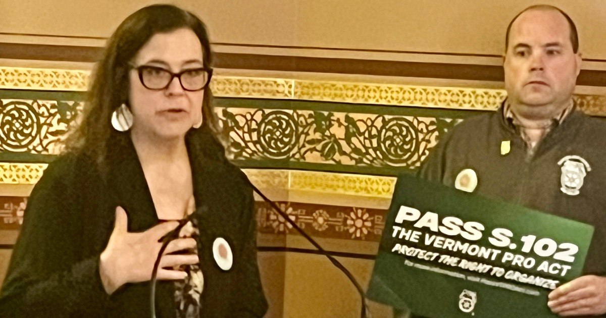 VSEA President Aimee Towne is pictured here delivering remarks at a press conference this morning, where she voiced VSEA’s strong support of S. 102, or the PRO Act; legislation that would make it easier to organize Vermont workers.