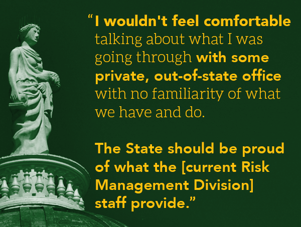 "I wouldn’t feel comfortable talking about what I was going through with some private, out-of-state office with no familiarity of what we have and do. The State should be proud of what the [current Risk Management Division] staff provide.”