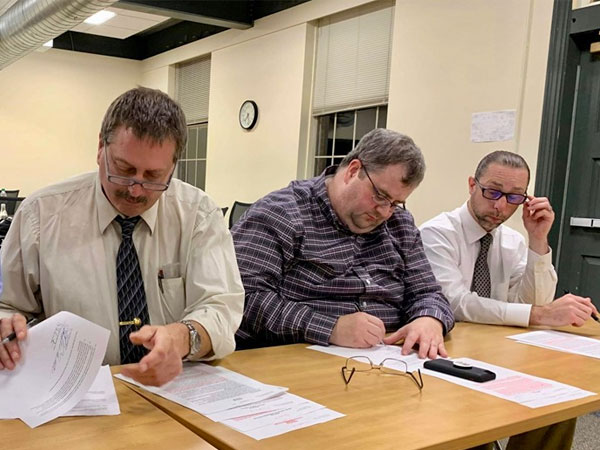 Pictured here signing the tentative agreement (at 7:30 p.m., by the clock on the wall) are (left to right) Supervisory Unit Chair Joe Silvestri, NMU Chair Bob Stone and Corrections Unit Chair Daniel Broe.