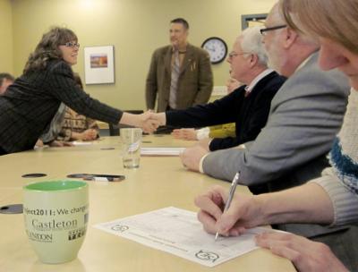 VSEA Vermont State Colleges’ (VSC) Bargaining Team members were at the VSC Chancellor’s office in Montpelier yesterday to participate in a contract–signing ceremony. Pictured here is VSEA President Shelley Martin shaking Chancellor Donovan’s hand after signing the Unit’s new contract, which was ratified in early January. (Click here for a larger image.)