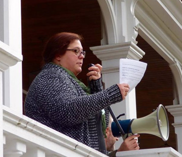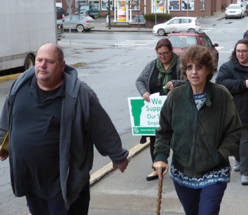 Taking advantage of the especially balmy temperatures that graced Vermont on Tuesday, VSEA members packed a small courtyard outside the Supreme Court and Pavilion Buildings in Montpelier to conduct a “worker safety” rally in advance of the 2016 legislative session, which begins on January 5. Holding signs reading “We Support Our State Employees” (which are now available for pickup at VSEA HQ!), VSEA members, supporters and the press heard firsthand accounts of the need for worksite safety enhancements from Economic Services Division Benefits Program Specialist (and VSEA First VP) Aimee Towne, Green Mountain Psychiatric Care Facility Mental Health Specialist Beverly Ordway, Judiciary Family Case Manager Bill Capasso and Department for Children and Families Social Worker Kara Haynes.