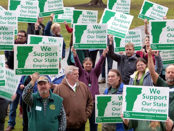 Taking advantage of the especially balmy temperatures that graced Vermont on Tuesday, VSEA members packed a small courtyard outside the Supreme Court and Pavilion Buildings in Montpelier to conduct a “worker safety” rally in advance of the 2016 legislative session, which begins on January 5. Holding signs reading “We Support Our State Employees” (which are now available for pickup at VSEA HQ!), VSEA members, supporters and the press heard firsthand accounts of the need for worksite safety enhancements from Economic Services Division Benefits Program Specialist (and VSEA First VP) Aimee Towne, Green Mountain Psychiatric Care Facility Mental Health Specialist Beverly Ordway, Judiciary Family Case Manager Bill Capasso and Department for Children and Families Social Worker Kara Haynes.