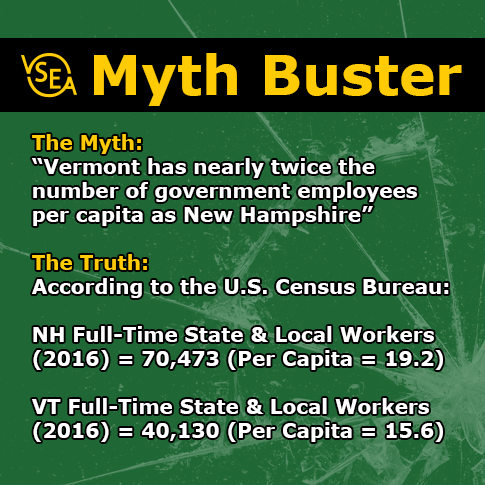 In a commentary posted this week to VTDigger, the past vice-chair of the Vermont GOP once again makes the false claim that the number of Vermont state and local workers is double that in New Hampshire. It’s simply not true, and VSEA members are urged to call out politicians, think-tank wonks and others who continue to promote this myth.