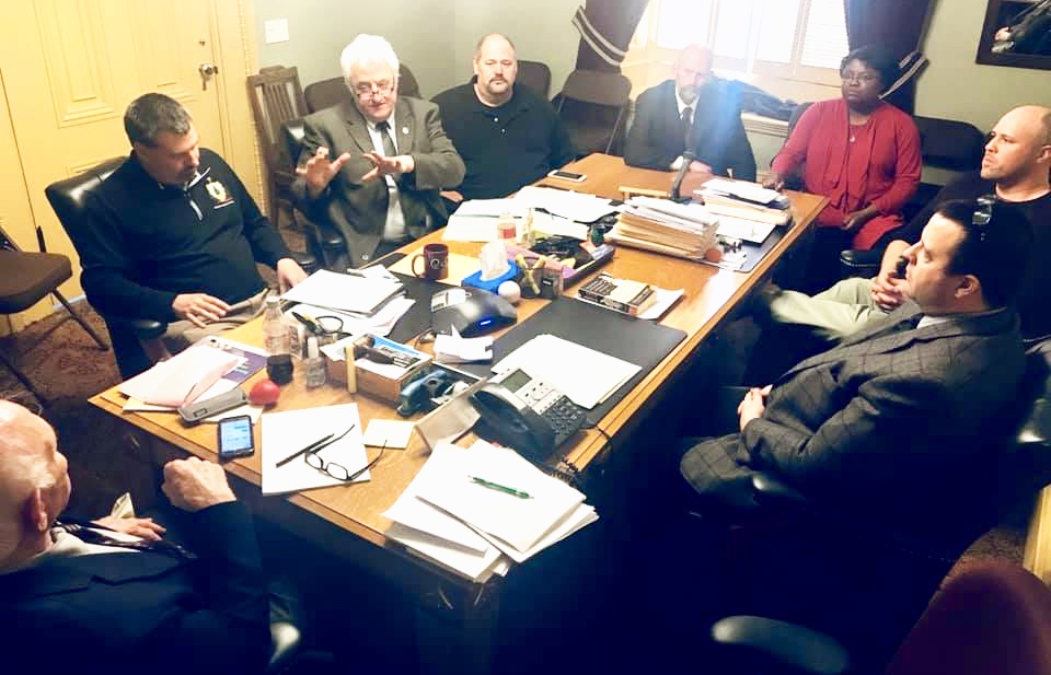 | A group of VSEA members, working for the DOC in various capacities, met this week with Senate Judiciary Committee Chairperson Dick Sears (D-Bennington) to talk about issues of concern to probation and parole officers, corrections officers and other DOC staff. Pictured here (l to r) from the head of the table are Sen. Dick Sears, Ethan Bacon, Herb Sinkinson, Dave Bellini, Carl Davis, Leona Watt, Mike Arace and Steve Howard. Sears requested the meeting because he wanted to hear firsthand from frontline DOC personnel. |