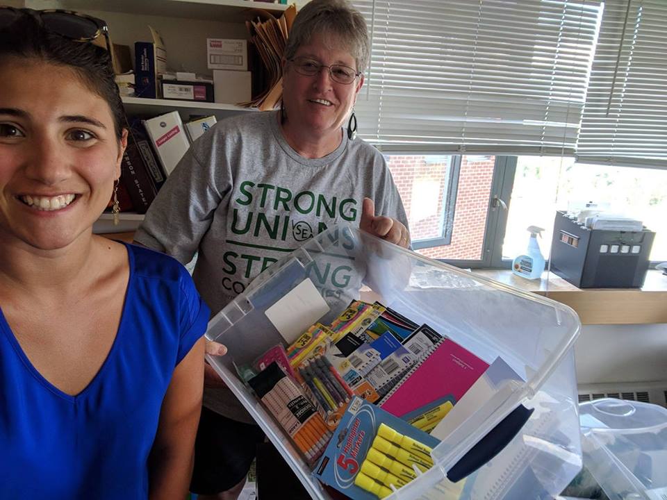 VSEA Member Sandra Noyes with VSEA Organizer Carmen Scoles, picking up school supplies at Northern Vermont University- Johnson