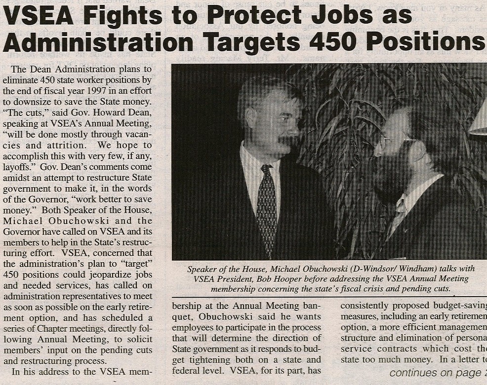 In past deficit years, VSEA members have been asked to voluntarily submit cost-savings ideas to headquarters, in hopes that some of your ideas could be adopted and implemented, eventually generating the funds needed to save a service or jobs. In 2010, the Vermont Legislature followed VSEA’s lead, passing legislation to provide cash awards to state employees whose ideas were vetted by a special committee and found to generate savings. Unfortunately, this legislation sunset in 2012, and lawmakers have not resurrected it–yet.