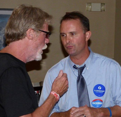 VT AG TJ Donovan talks with former VPCH leader Peter Bartlett at VSEA’s 2016 Annual Meeting reception.