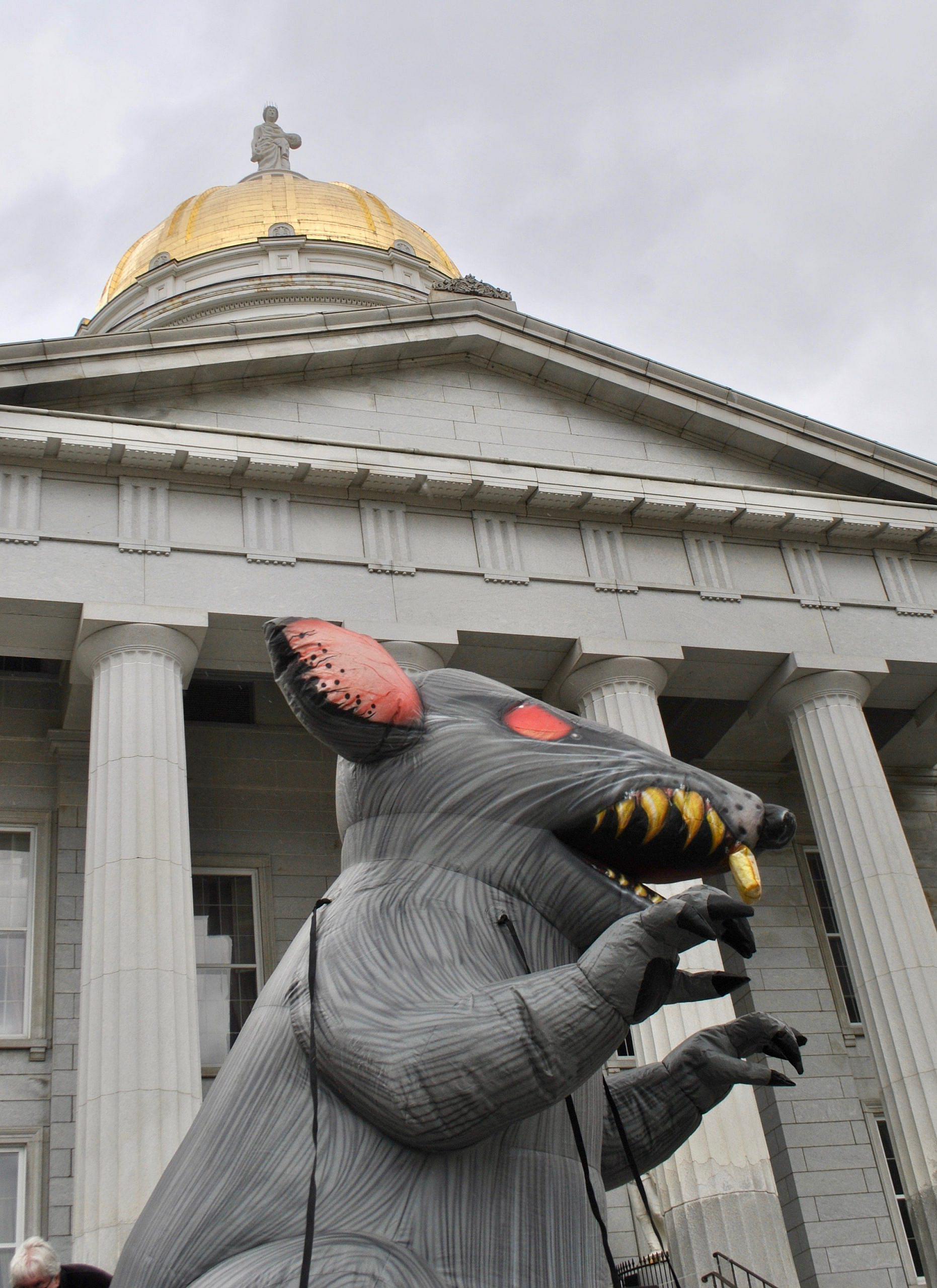 | "Scabby" made an appearance at an April 2015 Vermont labor rally outside the State House in Montpelier. |
