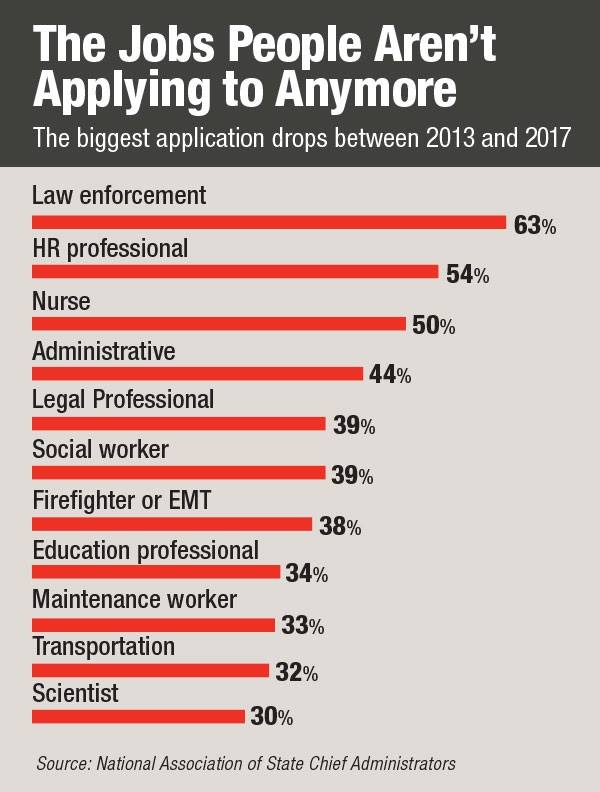 Even though postings for state government jobs rose 11 percent from 2013 to 2017, the number of applicants for those jobs dropped by 24 percent, according to a study that will be released this afternoon by the National Association of State Chief Administrators (NASCA).