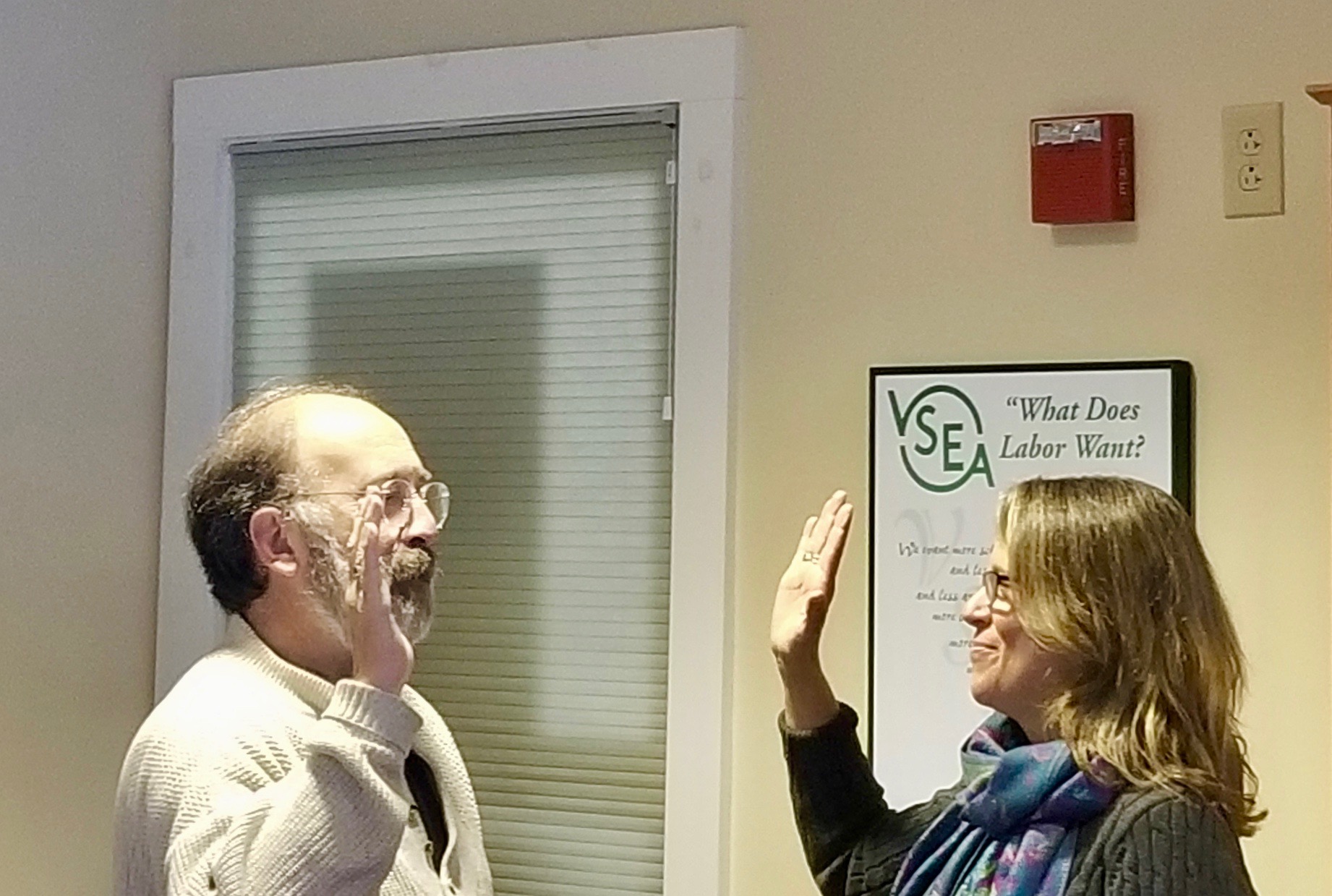 Newly elected VSEA Board of Trustees member Robin Rieske is pictured above being officially sworn into the body by current Board member Bob Hooper, who also serves his union as Retiree Chapter President and who just won election to the Vermont House.