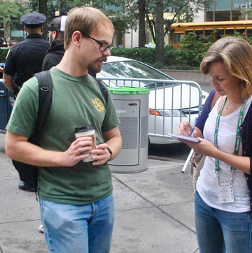 VSEA is saying goodbye today to Organizer Tim Boyle (pictured here, talking with a reporter at the 2014 Climate Change march in NYC), who is sadly leaving the union to go to work for another cause he cares deeply about. Tim started with VSEA in April 2013.
