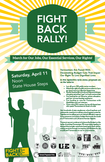 Rally momentum continues to build. This week, more than a dozen labor unions, community and environmental organizations and even a political party signed on to co-sponsor the VSEA Fight Back Rally, being held noon, Saturday, April 11, at the State House in Montpelier. The rally is a chance for state employees to come together with supporters to send a strong message to Montpelier that more cuts to services and good-paying, middle-class jobs is a failed approach that doesn’t produce savings and only hurts Vermonters in need.
